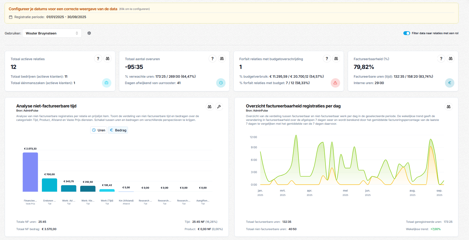 Stel een target in (bijv. 75% klantenuren) en zie direct of je voldoende factureerbaar werk doet. Afwezigheid en recuperatie worden niet meegeteld, dus je krijgt een realistisch beeld.