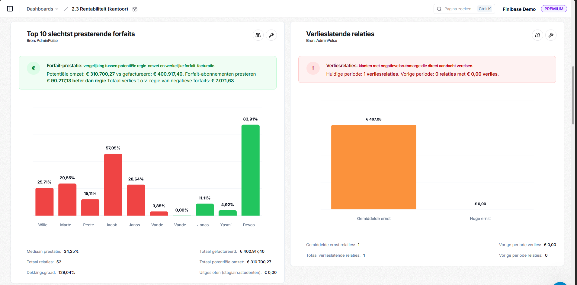 Zie in realtime welke forfaits onder de verwachting presteren. De widget vergelijkt wat je effectief factureerde met wat je zou gefactureerd hebben in regie. Zo spot je meteen waar je geld laat liggen.