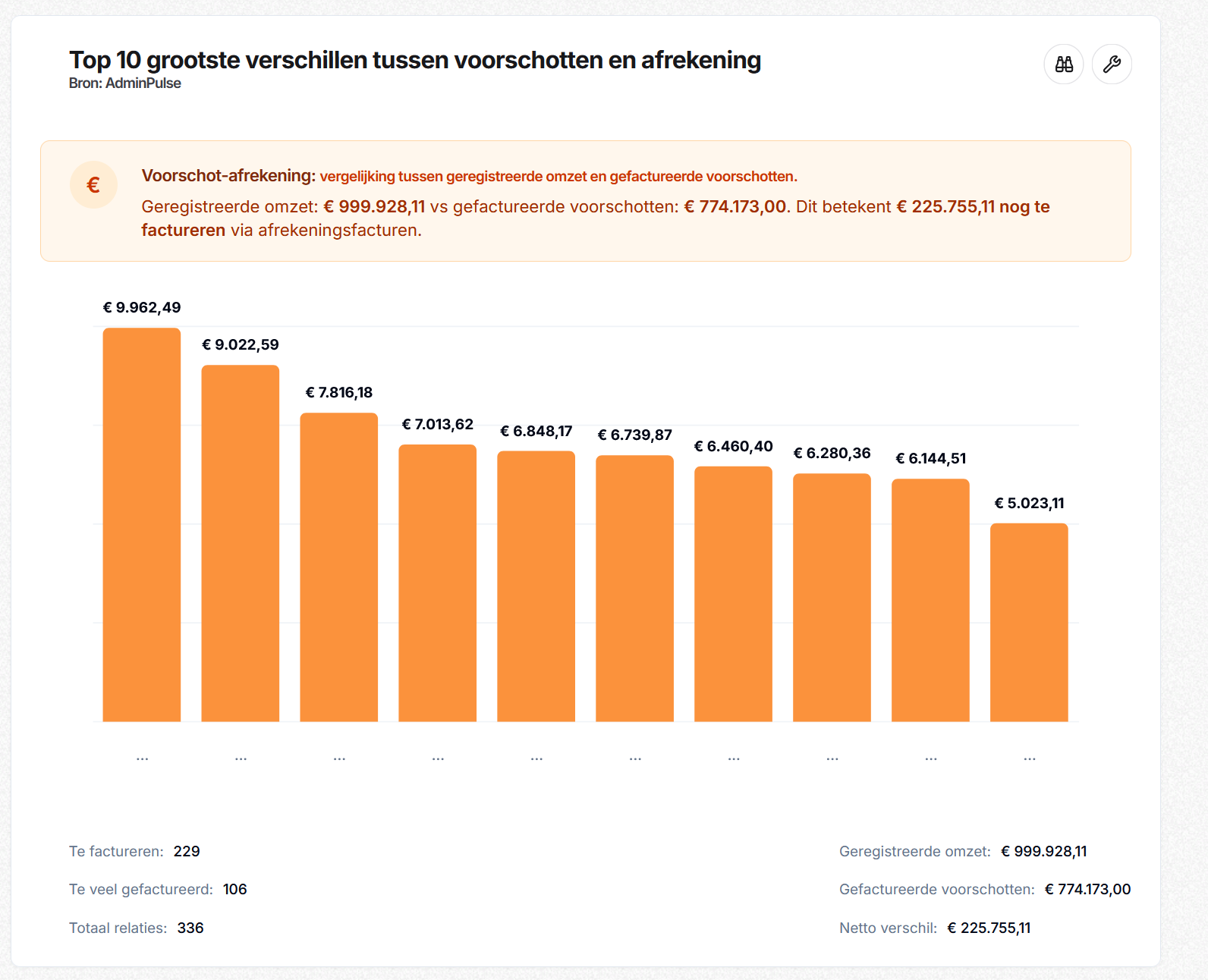 De "Top 10 grootste verschillen tussen voorschotten en afrekening" vergelijkt je gefactureerde voorschotten met je geregistreerde omzet.