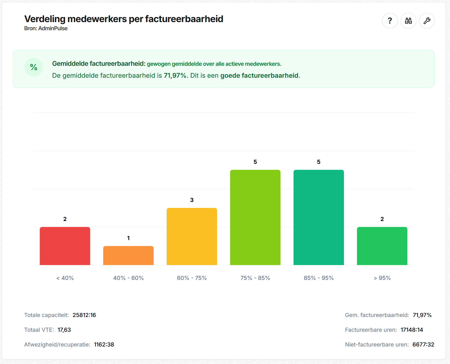 We hebben een nieuwe widget toegevoegd die je team verdeelt over factureerbaarheidscategorieën. Je ziet meteen welke medewerkers goed presteren, wie extra aandacht nodig heeft en waar coaching of herverdeling van werk zinvol kan zijn.