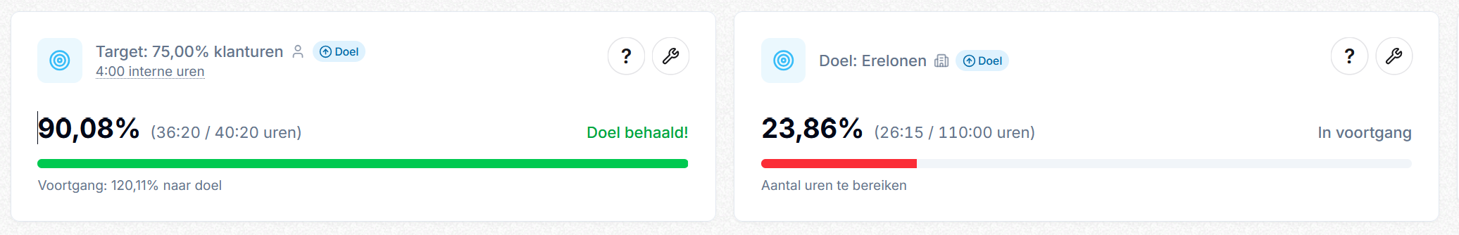 De widget toont direct je voortgang met kleurcodering: van rood (nog veel te doen) naar groen (doel behaald). Bij een kortere dashboardperiode wordt je doel automatisch pro-rata aangepast.