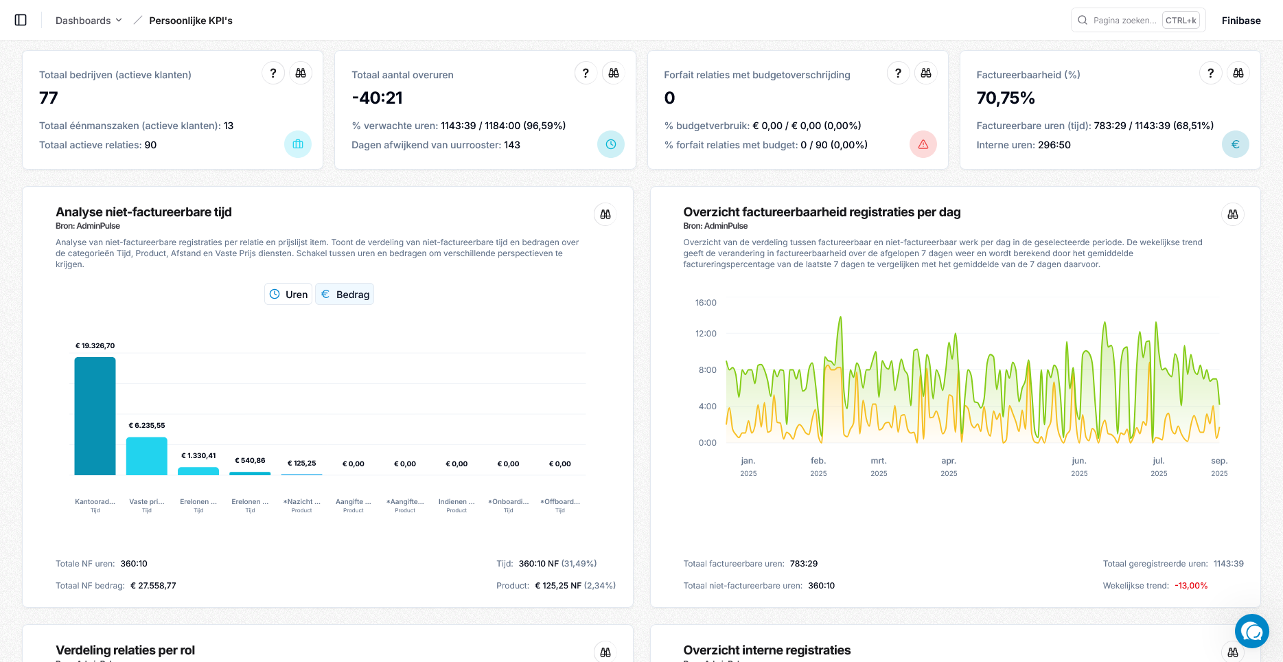 De berekening van factureerbaarheid is volledig vernieuwd. Het dashboard kijkt nu niet alleen naar geregistreerde tijd, maar ook naar producten, verplaatsingen en vaste prijsdiensten. Dankzij de nieuwe logica krijgt u een eerlijk en volledig beeld van factureerbare en winstgevende activiteiten.