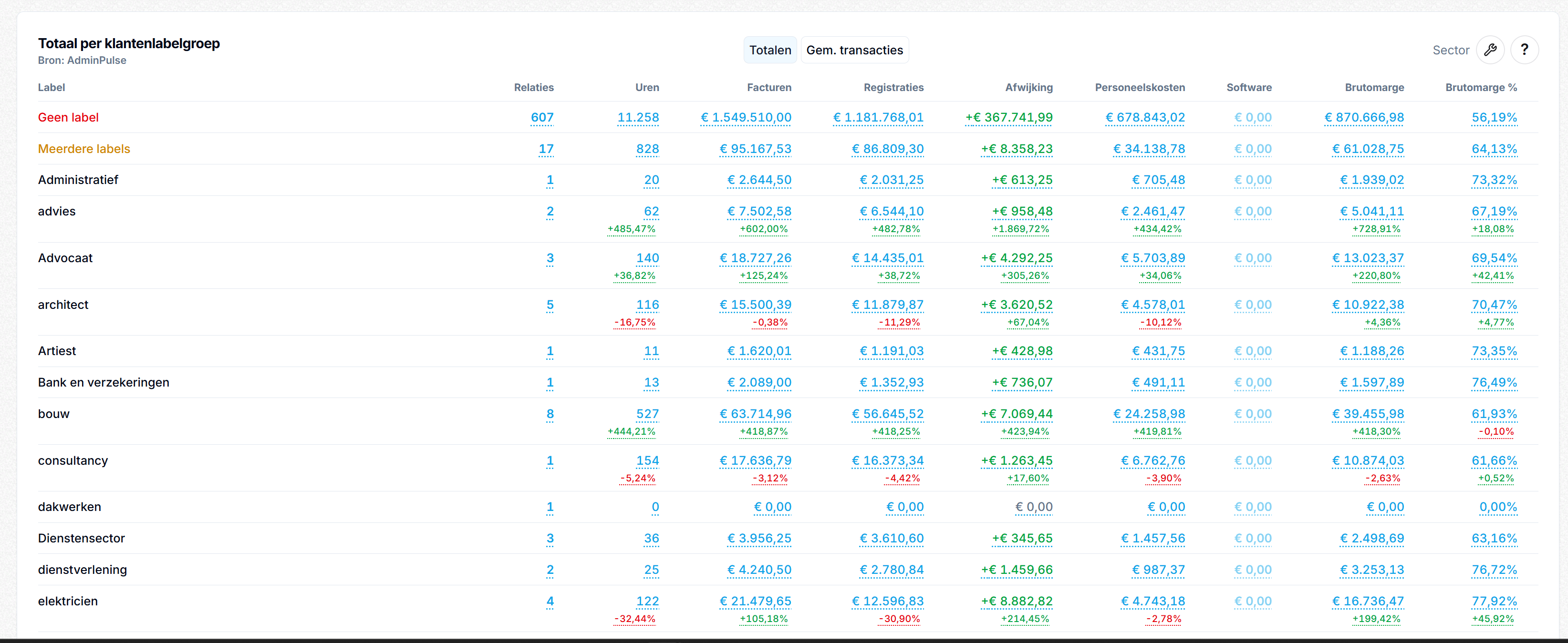 De widget groepeert je klanten op basis van de labelgroepen die je in Finibase configureert op basis van relatielabels uit AdminPulse, en toont per groep de belangrijkste financiële cijfers: