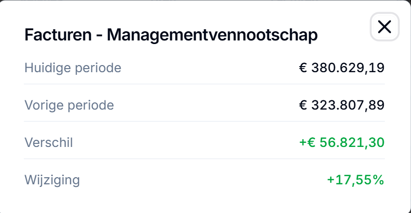 Onder elk bedrag zie je automatisch het verschil met de vorige periode. Klik op een percentage om de volledige vergelijking te zien: huidig bedrag, vorig bedrag, absoluut verschil en procentuele wijziging.