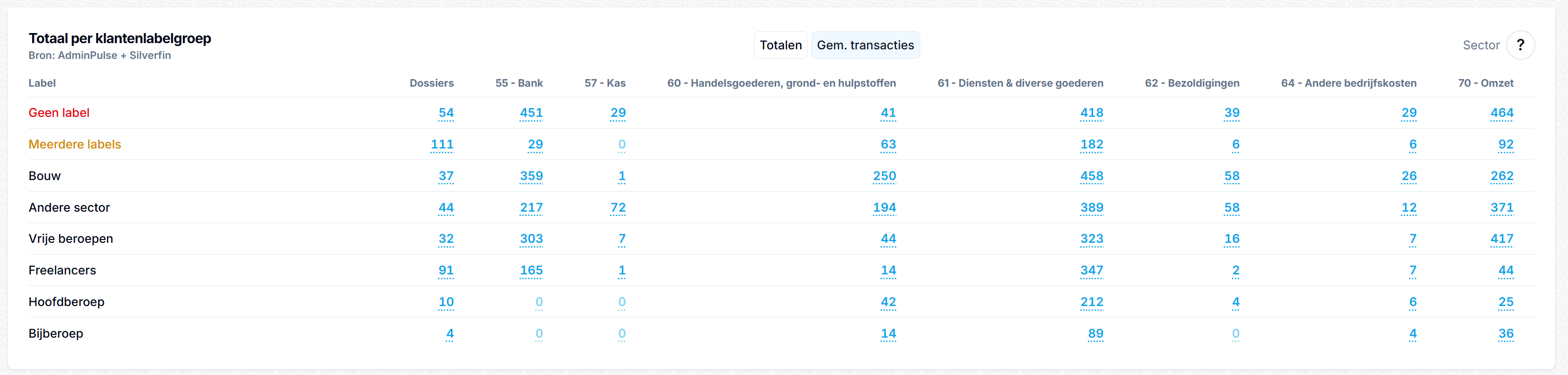 Werk je met Silverfin? Schakel naar de weergave "Gem. transacties" om per labelgroep het gemiddeld aantal boekingen te zien, uitgesplitst per rekeningcategorie.